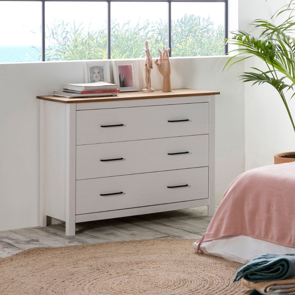 Comò Miranda con 3 cassetti in legno massiccio bianco e top pino