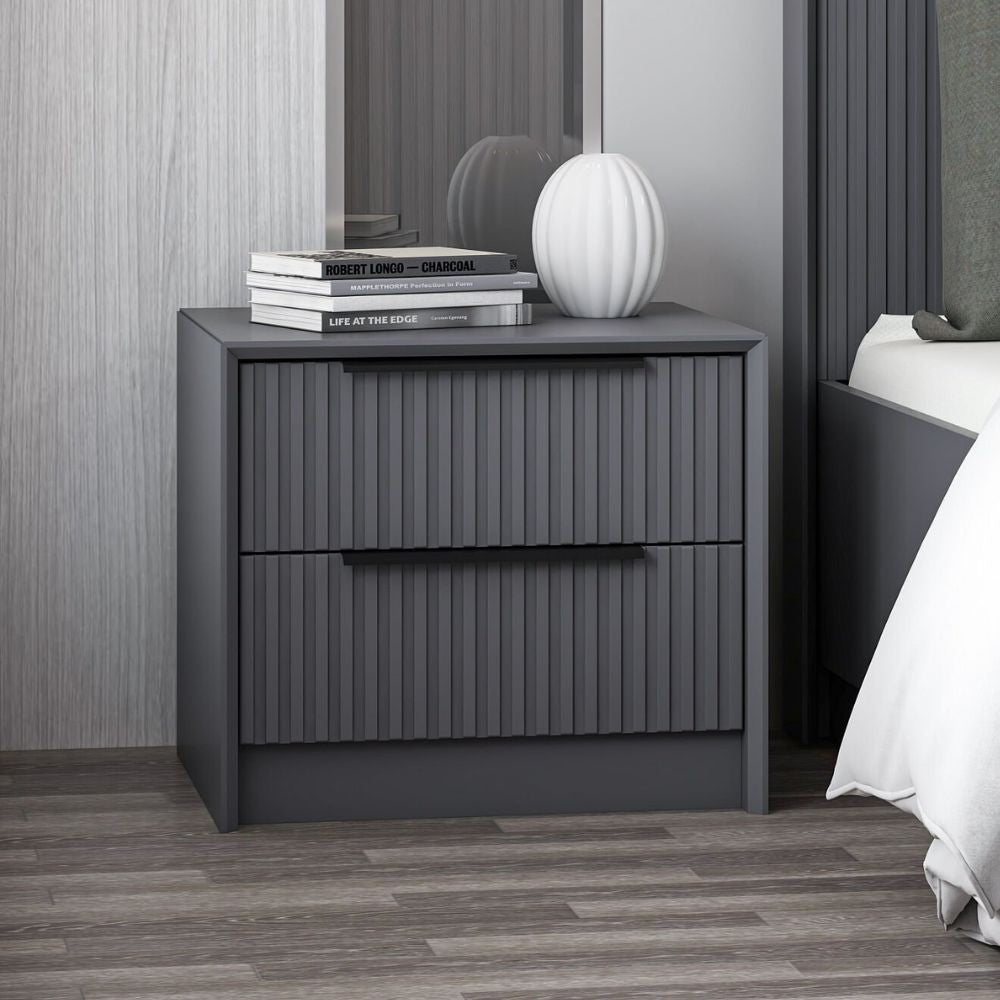 Comodino Kale in colore antracite con due cassetti incassati ad effetto cannettato