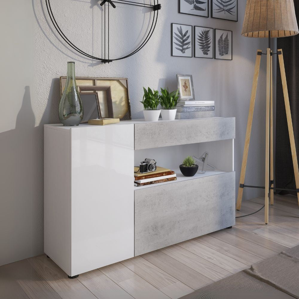Aumenta quantità per Madia Astra con un'anta e un'anta a ribalta un cassetto e un vano a giorno colore cemento e bianco larice