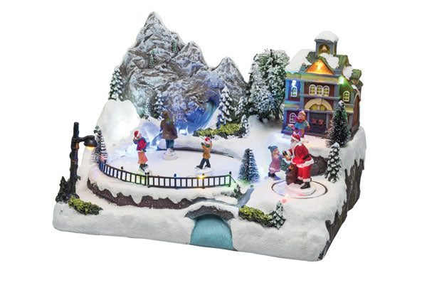 Villaggio lago montano con Babbo natale e pattinatori in movimento